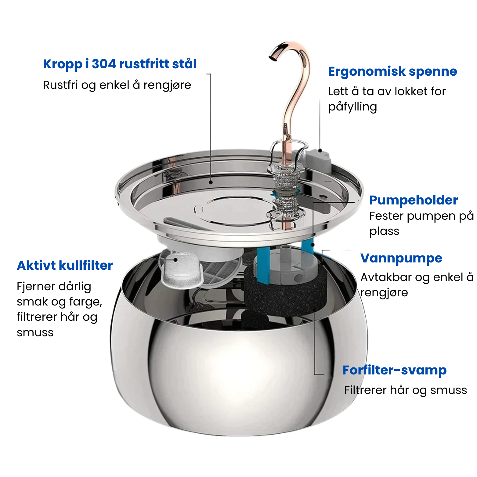 Tre-funksjons-kull-filteret fjerner magnesium, kalsium, hår, smuss og andre urenheter fra kattens vann. Disse mineralene kan hope seg opp i kjæledyrets nedre urin-veier og føre til urin-veis-infeksjon
